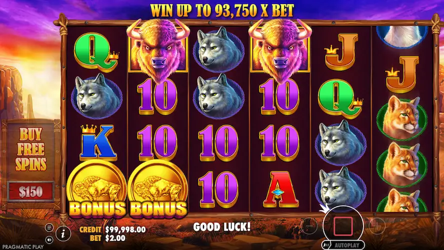 Najwyższe wartości mają symbole przedstawiające bizona – to one mogą przynieść największe wygrane, szczególnie podczas rundy darmowych spinów. Niższe wartości reprezentowane są przez standardowe karty: A, K, Q, J i 10, ozdobione motywami dzikiego zachodu.