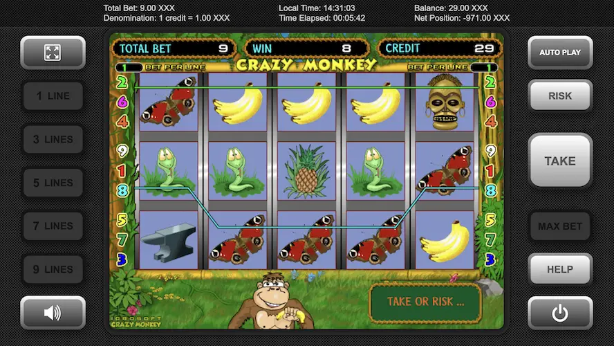 Mechanika gry opiera się na pięciu bębnach i dziewięciu stałych liniach wypłat. Aby wygrać, wystarczy trafić co najmniej trzy identyczne symbole na jednej z aktywnych linii, licząc od lewej strony. Symbole obejmują banany, kokosy, papugi oraz oczywiście głównego bohatera – szalonego małpa. Najwyższą wypłatę daje kombinacja pięciu małp – może ona przynieść nawet 10 000-krotność stawki za linię.