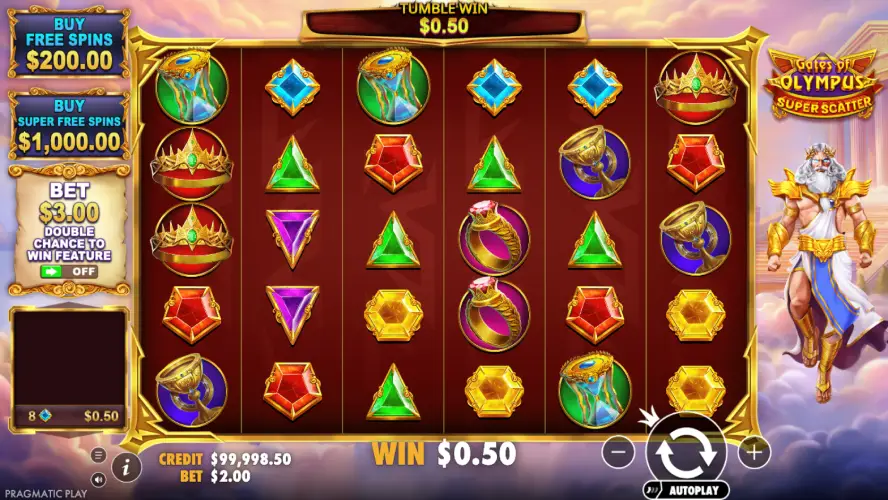 Podczas rozgrywki gracze napotykają mityczne postacie greckie, w tym samego Zeusa, który pełni rolę symbolu dzikiego (Wild). Najważniejszą cechą tej wersji jest jednak pojawienie się tzw. Super Scatter – specjalnego symbolu, który aktywuje unikalne bonusy i mnożniki, niedostępne w oryginalnej wersji gry.